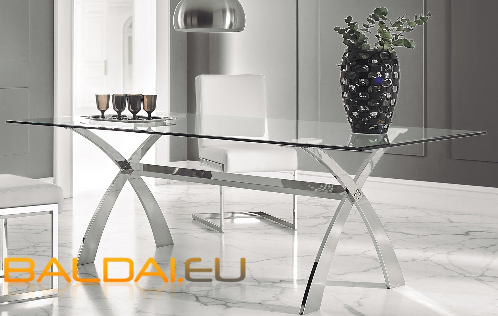 "Steel" - tai modernaus dizaino stalas, kurio viršus iš skaidraus, grūdinto, 12 mm stiklo su metalinėmis kojelėmis, papuošiantis Jūsų svetainę ar valgomąjį.
