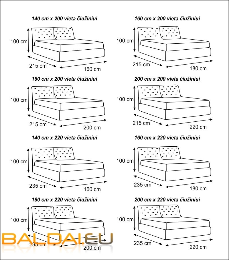 Pritaikyta čiužiniui: (standartiniai išmatavimai 1600 x 2000mm). Galima pagaminti ir kitų išmatavimų čiužiniui.